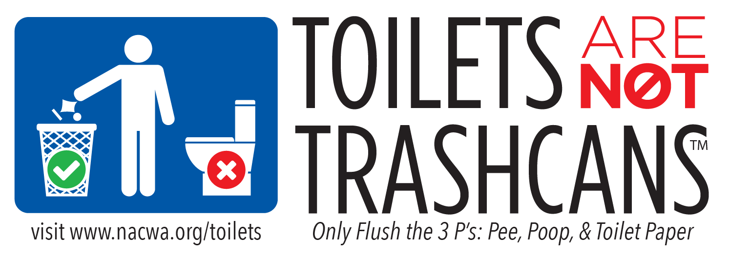 The NACWA Toilets Are Not Trashcans logo (below) may be used free of charge on any consumer education materials. There are no restrictions for using the logo, as long as it for educational purposes about what to flush, what not to flush, or other general information about the sewer system and wastewater treatment. You are welcome to edit the logo for use by your utility if any changes are in keeping with the spirit of the Toilets Are Not Trashcans message.